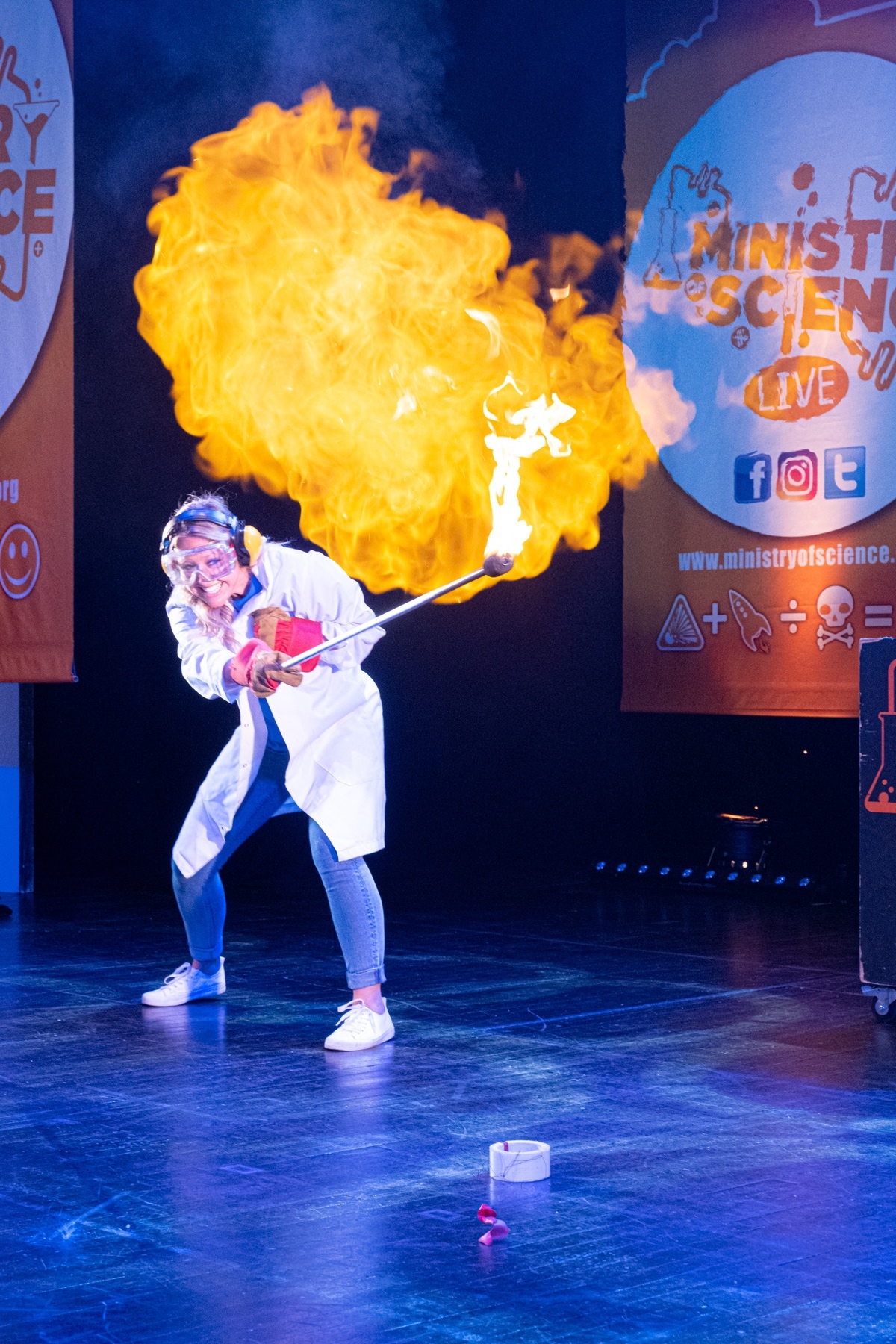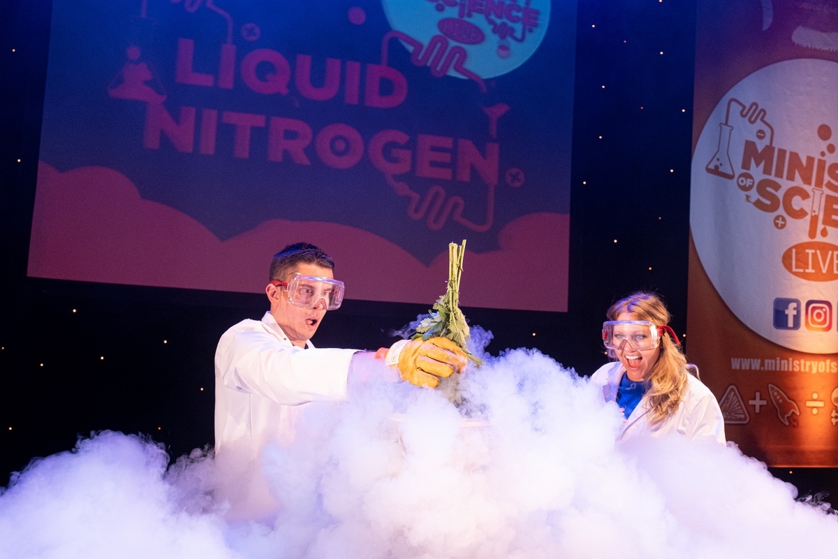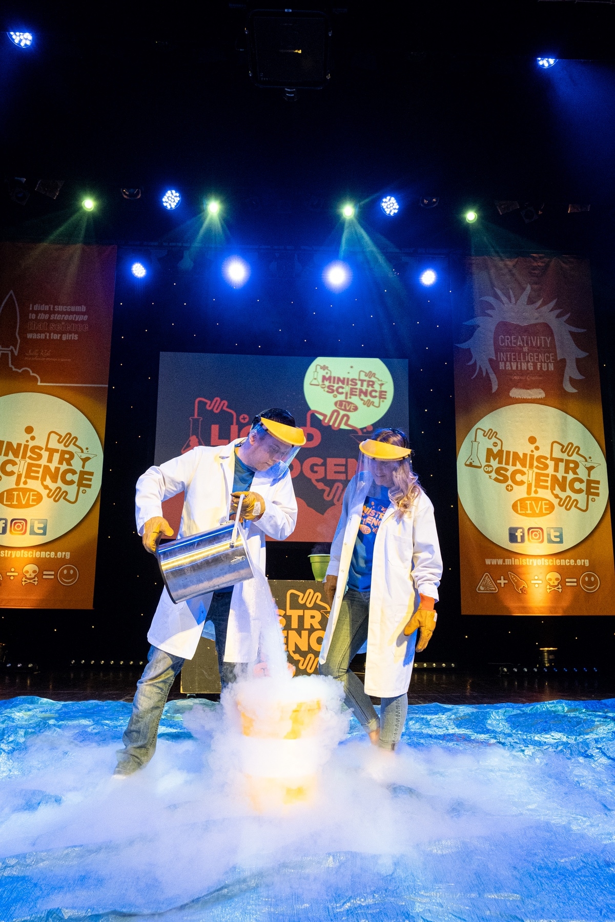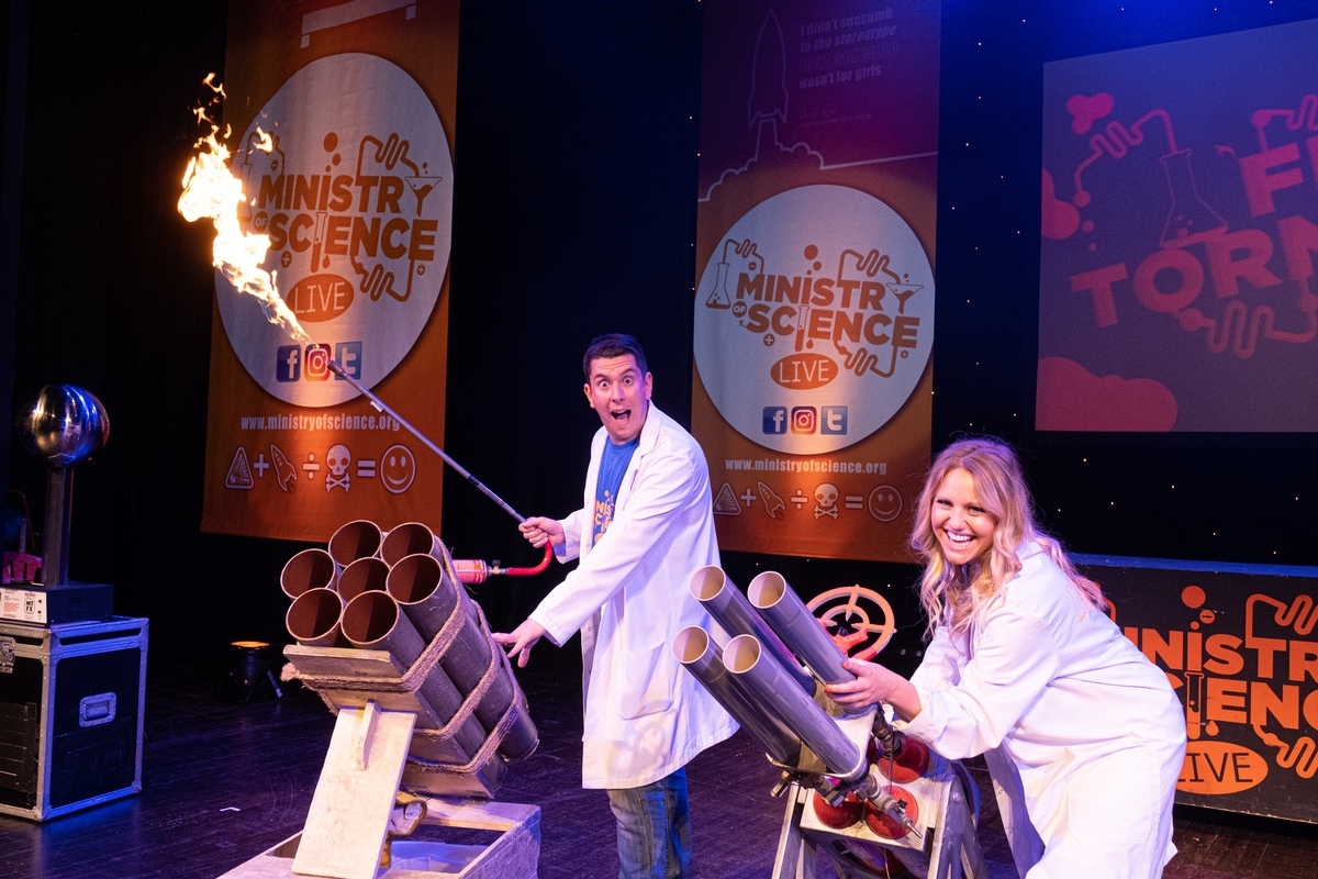 WARNING! WARNING! 100% Educational. 200% Entertaining. 300% Explosive. 400% Fun. This is a public safety announcement…..Please keep your head firmly on your shoulders, and your arms, legs and feet inside the ride at all times – Ministry of Science Live is about to explode onto the stage! Ministry of Science Live is not your ordinary science show – it comes with a bang. It comes with a whoosh. But most of all is comes with a hovercraft built on stage…. Oh, and a Human Cannon too! This new production takes an anarchic approach to science communication whilst looking at the inventors and engineers who have shaped and inspired the modern world that we live in. From Liquid Nitrogen frozen flowers to Hydrogen Bottle Rockets. From Buzz Aldrin to Virgin Galactic. From a cat food tin to the Hovercraft. From the discovery of Methane to the invention of the Battery. Join the super talented presenters and the voiceover from above (X Factor’s Peter Dickson) as they take you on a journey using brilliantly designed demonstrations with a few loud bangs to lead the way. Fingers in ears advised….