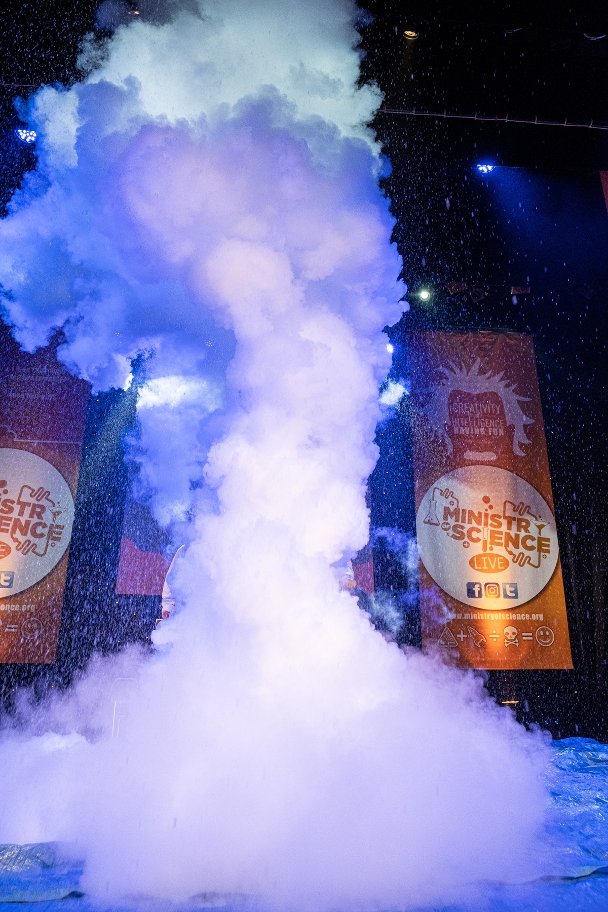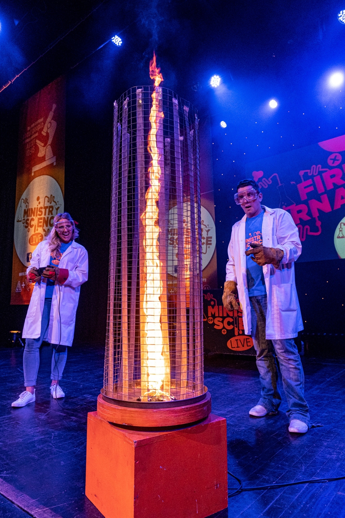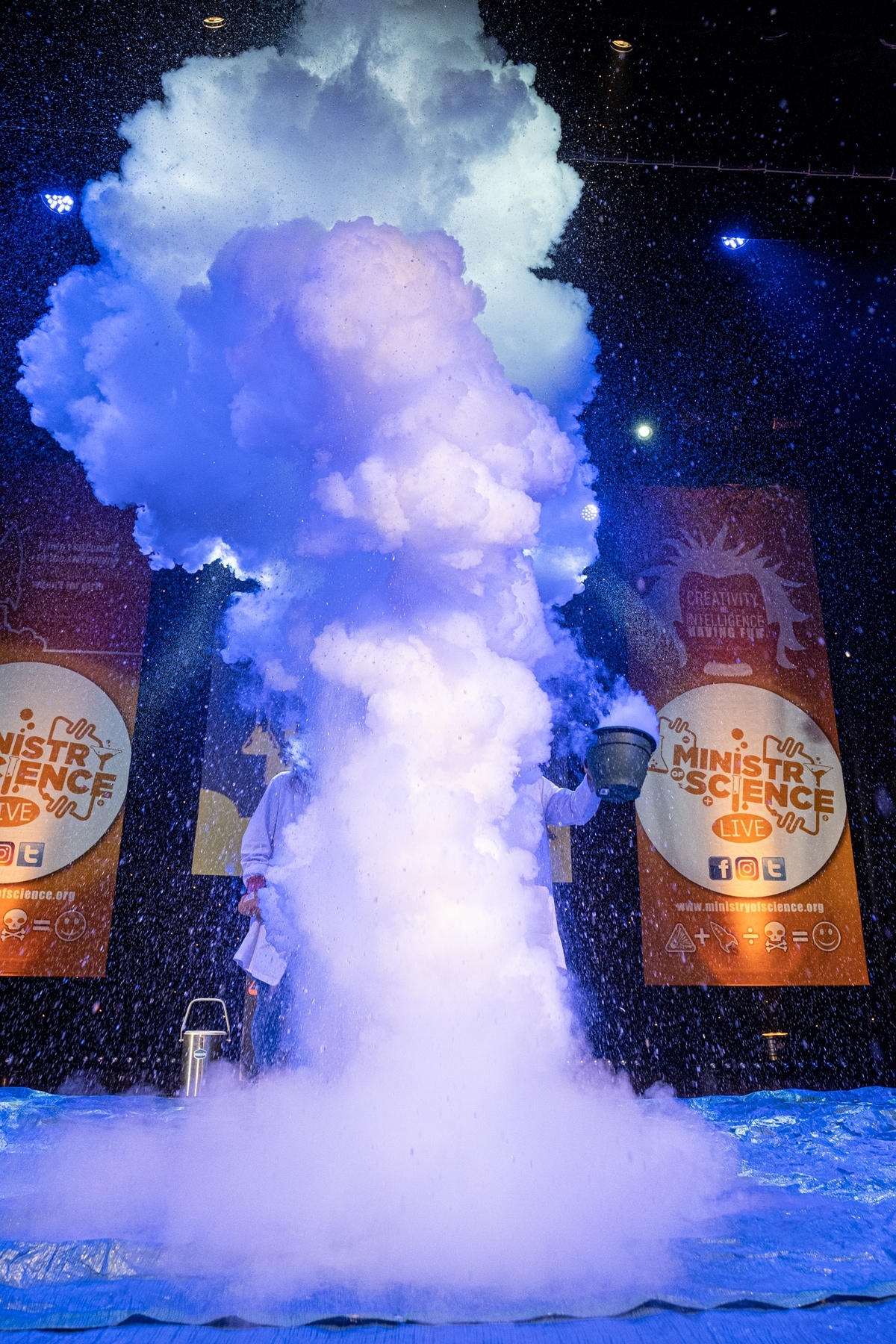 WARNING! WARNING! 100% Educational. 200% Entertaining. 300% Explosive. 400% Fun. This is a public safety announcement…..Please keep your head firmly on your shoulders, and your arms, legs and feet inside the ride at all times – Ministry of Science Live is about to explode onto the stage! Ministry of Science Live is not your ordinary science show – it comes with a bang. It comes with a whoosh. But most of all is comes with a hovercraft built on stage…. Oh, and a Human Cannon too! This new production takes an anarchic approach to science communication whilst looking at the inventors and engineers who have shaped and inspired the modern world that we live in. From Liquid Nitrogen frozen flowers to Hydrogen Bottle Rockets. From Buzz Aldrin to Virgin Galactic. From a cat food tin to the Hovercraft. From the discovery of Methane to the invention of the Battery. Join the super talented presenters and the voiceover from above (X Factor’s Peter Dickson) as they take you on a journey using brilliantly designed demonstrations with a few loud bangs to lead the way. Fingers in ears advised….